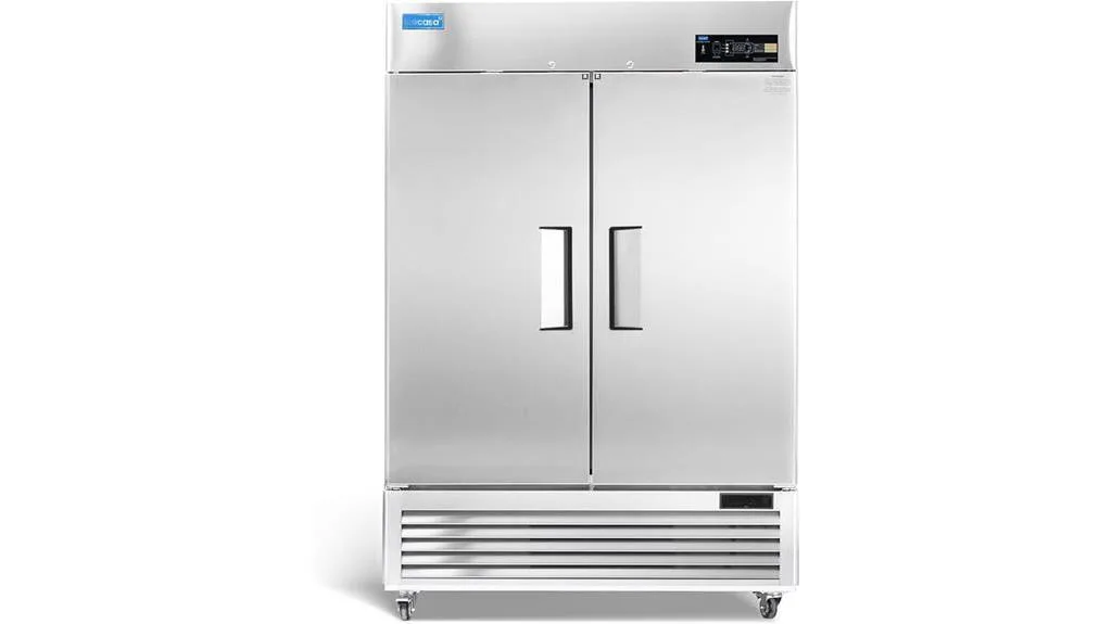 For busy restaurant owners or food service professionals seeking reliable storage solutions, the 54" Commercial Stainless Steel Reach-in Freezer stands out as an ideal choice. With a generous 49 cu. ft. capacity and eight adjustable shelves, it provides ample space for all your frozen items. The heavy-duty stainless steel construction guarantees durability, while the high-density polyurethane foam insulation keeps energy costs down. I appreciate the digital temperature control that ranges from -8°F to 0°F, and the automatic defrost feature prevents ice buildup. Plus, the self-closing doors and built-in LED lighting make accessing contents easy, even in busy kitchens. Users rave about its swift cooling and low maintenance, making it a valuable addition to any food service operation.